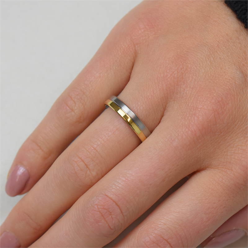 Deze gematteerde bicolor ring van Boccia Titanium heeft een glanzend en goudkleurig accent. De ring is 4,3mm breed.