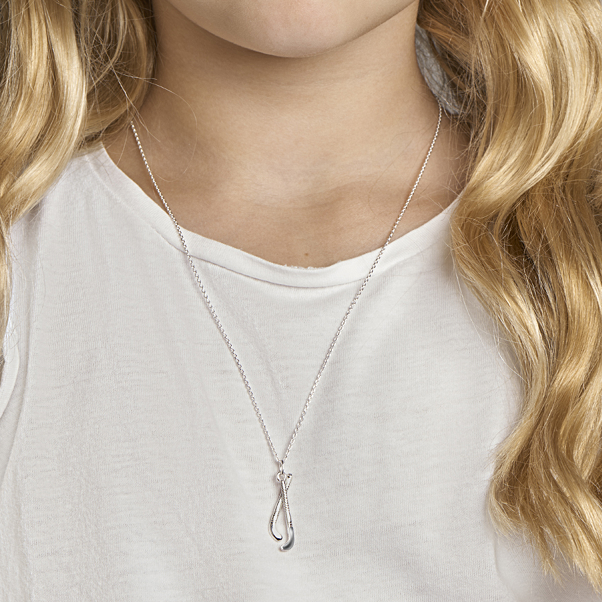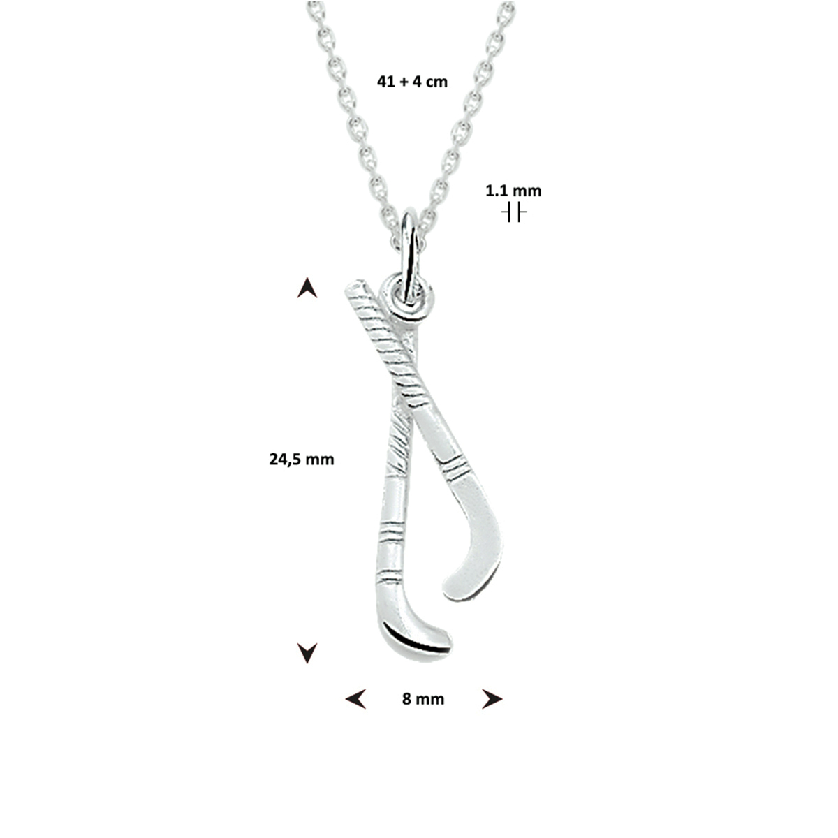 Zilveren collier met hockeysticks. De lengte van het collier bedraagt 41cm met 4cm extensie en de schakelbreedte is 1.1mm.