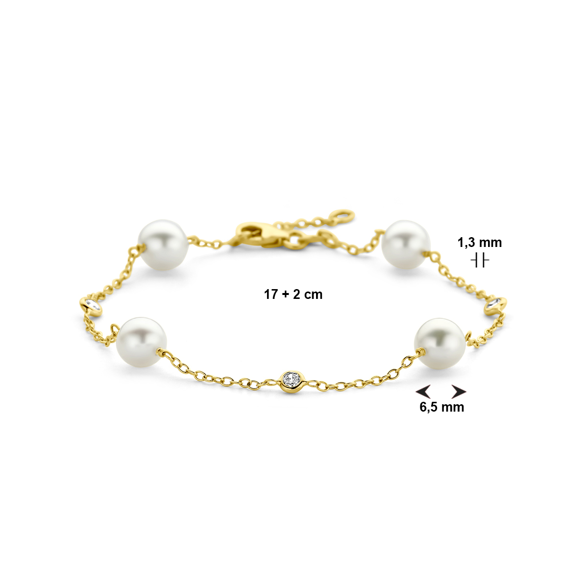 14k Geelgouden armband uitgevoerd met zoetwaterparels, zirkonia en een karabijn sluiting. De armband heeft draaglengte van 17 en 19cm. De schakelbreedte is 1.3mm.