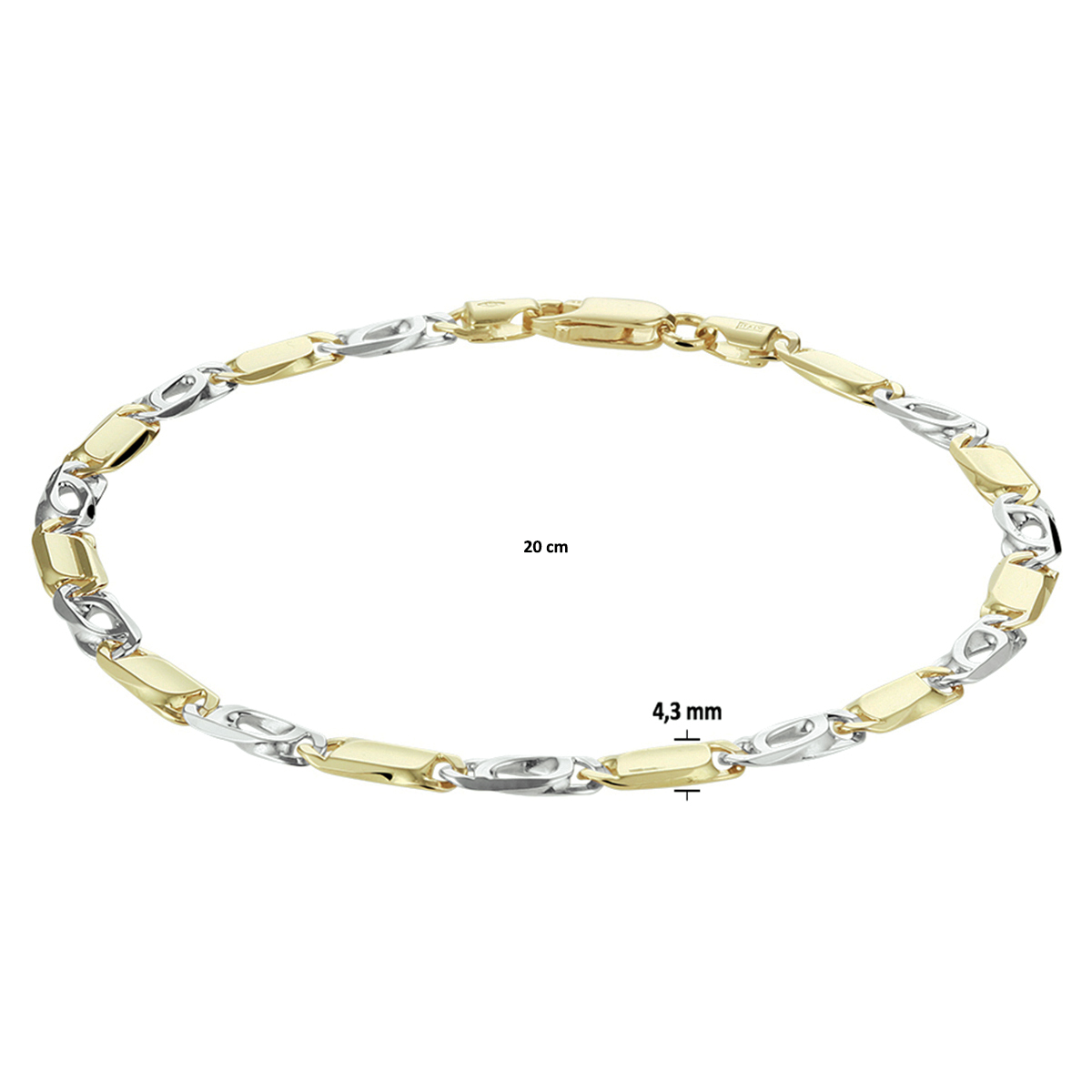14k Bicolor wit- en geelgouden armband met een valkenoog schakel. De armband is uitgevoerd met een karabijn sluiting. De schakelbreedte is 4.3mm.