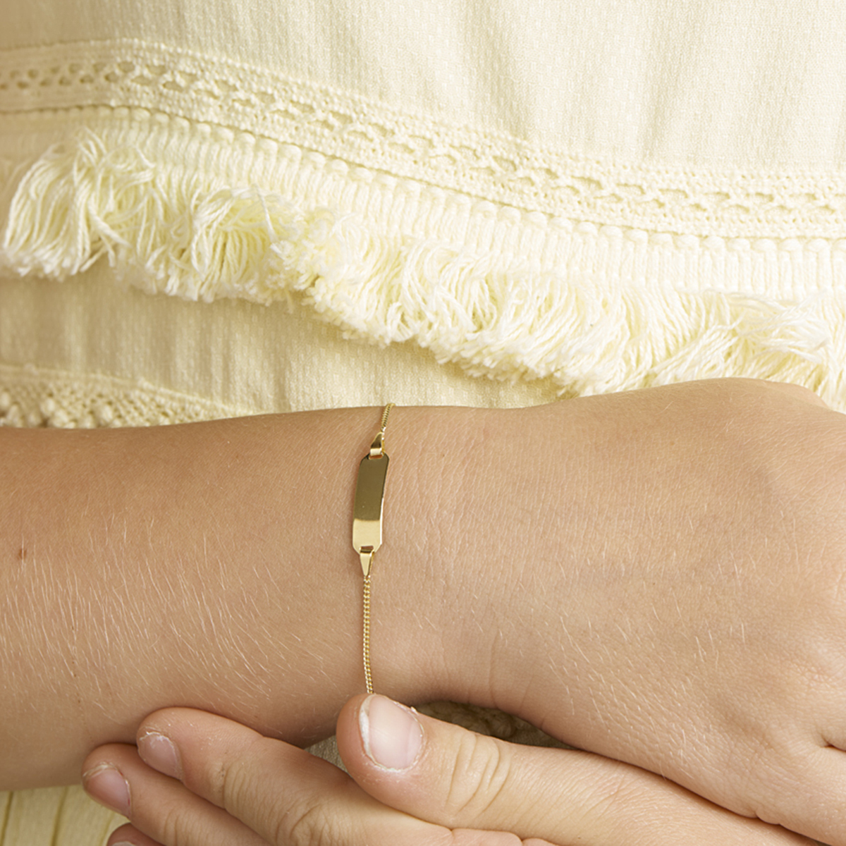 Geelgouden graveerarmband met een poli afwerking. De graveerplaat heeft een dikte van 0.5mm. De schakelbreedte is 1.0mm.