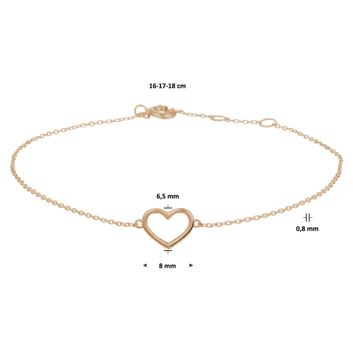Dit fijne 14k rosegouden armbandje met een open hartje geeft je outfit een vriendelijke touch. De armband heeft draaglengtes van 16, 17 en 18cm. De schakelbreedte is 0.8mm. Dit fijne 14k rosegouden armbandje met een open hartje geeft je outfit een vriendelijke touch. De armband heeft draaglengtes van 16, 17 en 18cm. Tip: Combineer de armband met bijpassende hartjes sieraden uit onze collectie voor een romantische uitstraling!