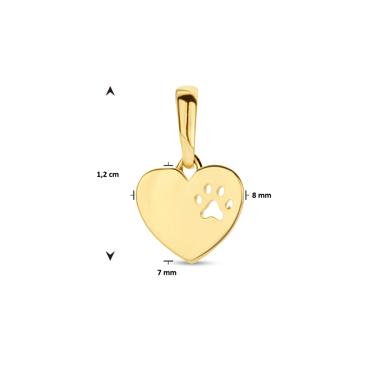 14k Geelgouden hanger uitgevoerd in de vorm van een hart met een hondenpootje voorstelling. Het hartje heeft een afmeting van 7x8mm.