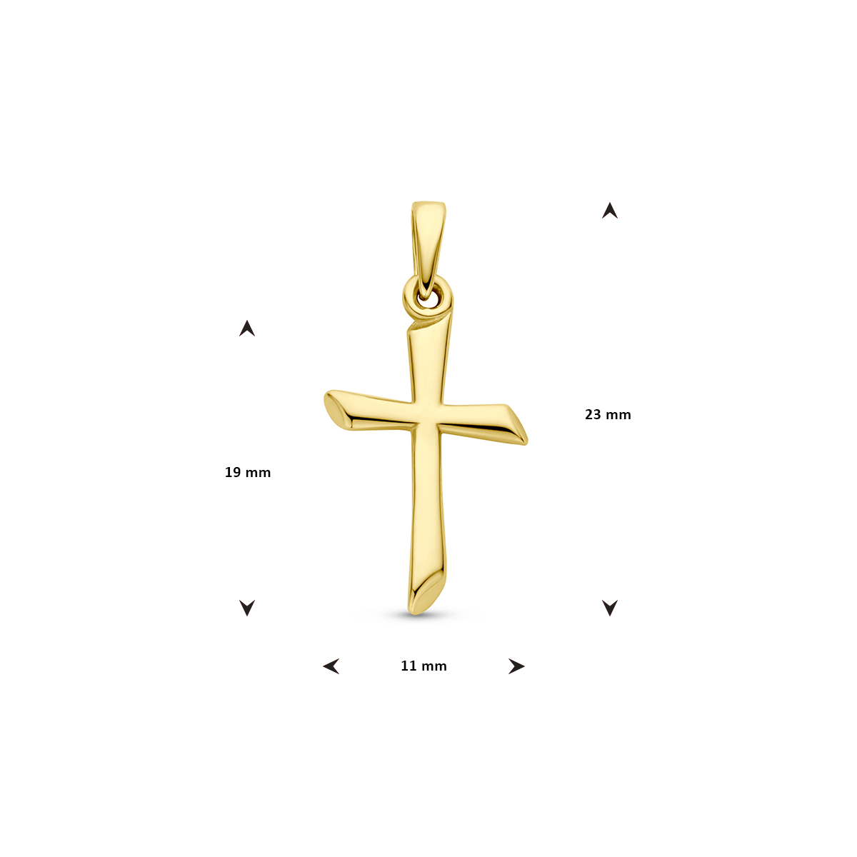 14k Geelgouden hanger in de vorm van een kruis. Het kruis heeft een afmeting van 19x11mm.