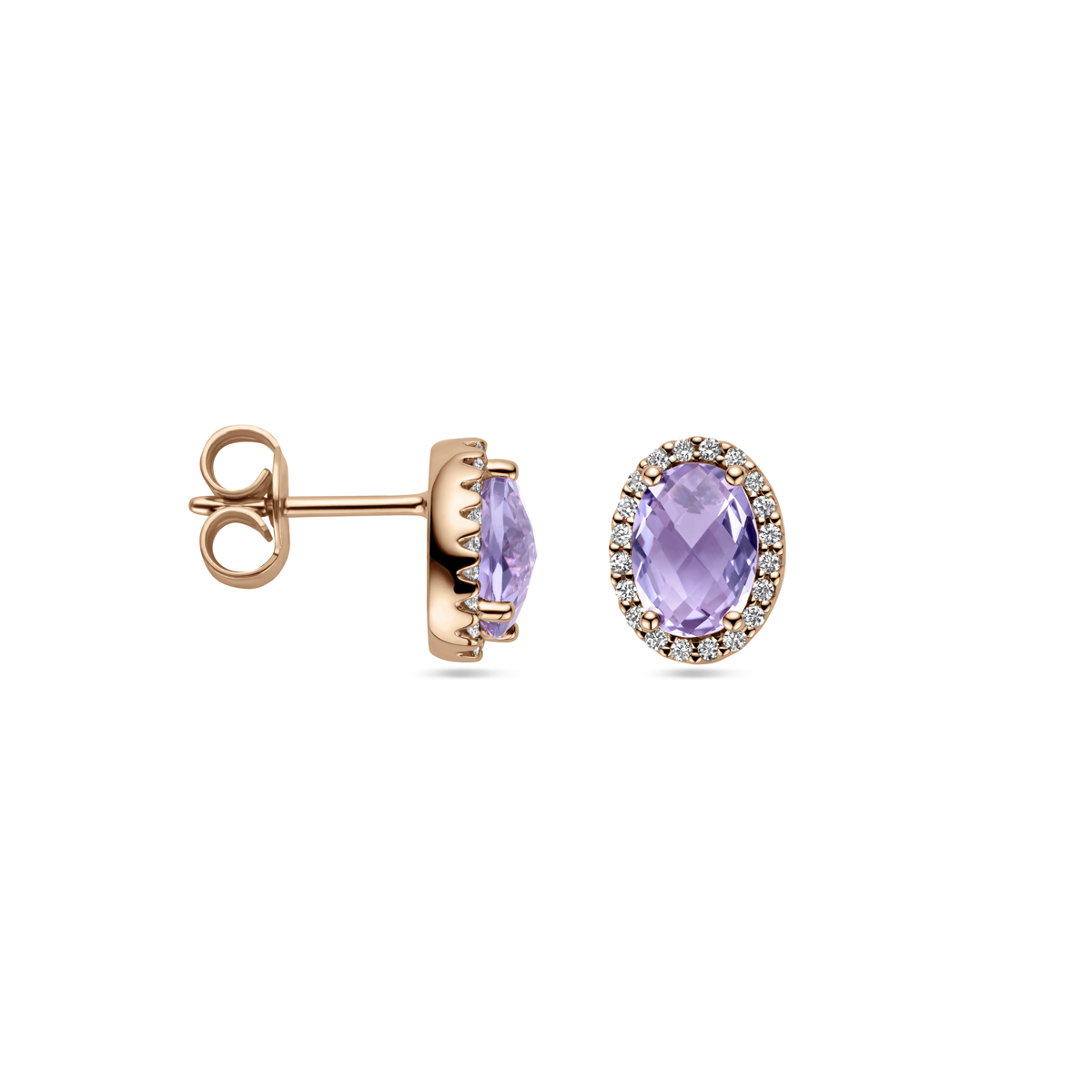 14k Roségouden oorknoppen uitgevoerd met amethist en diamant. De oorknoppen hebben een afmeting van 9.5x7.5mm. Het diamantgewicht is 0.13ct (2x 0.065ct).
