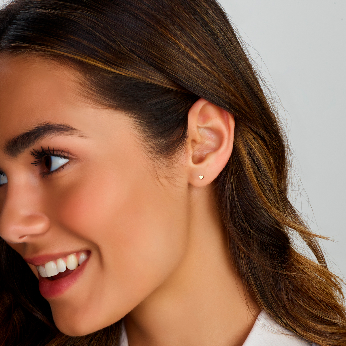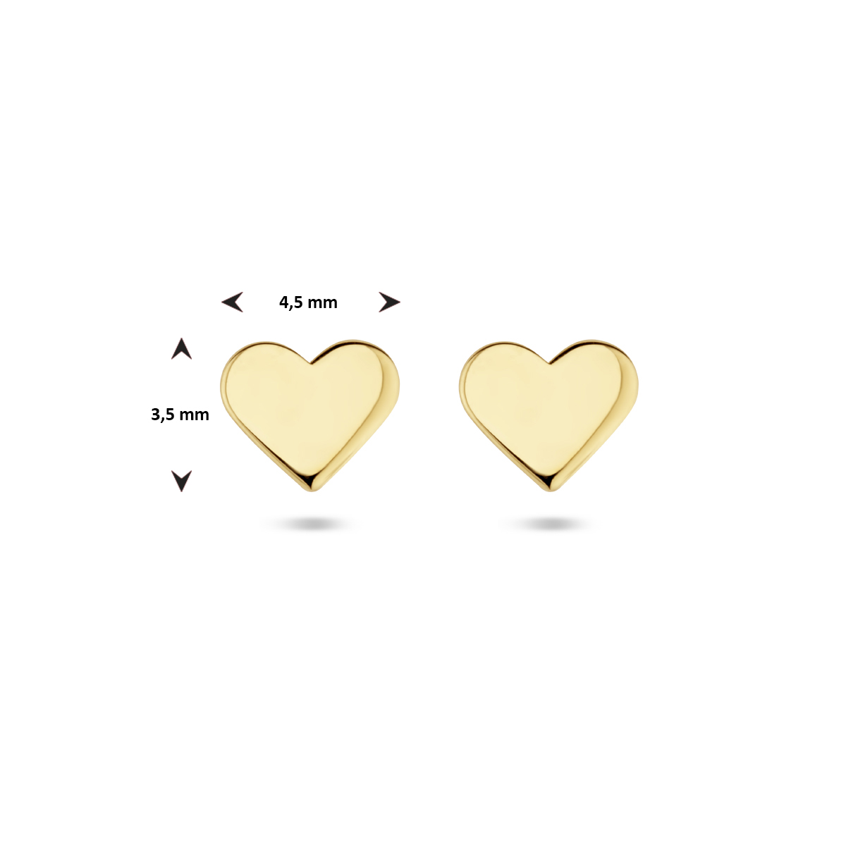 14k Geelgouden oorknoppen uitgevoerd in de vorm van een hart. De oorknoppen hebben een afmeting van 3.5x4.5mm.