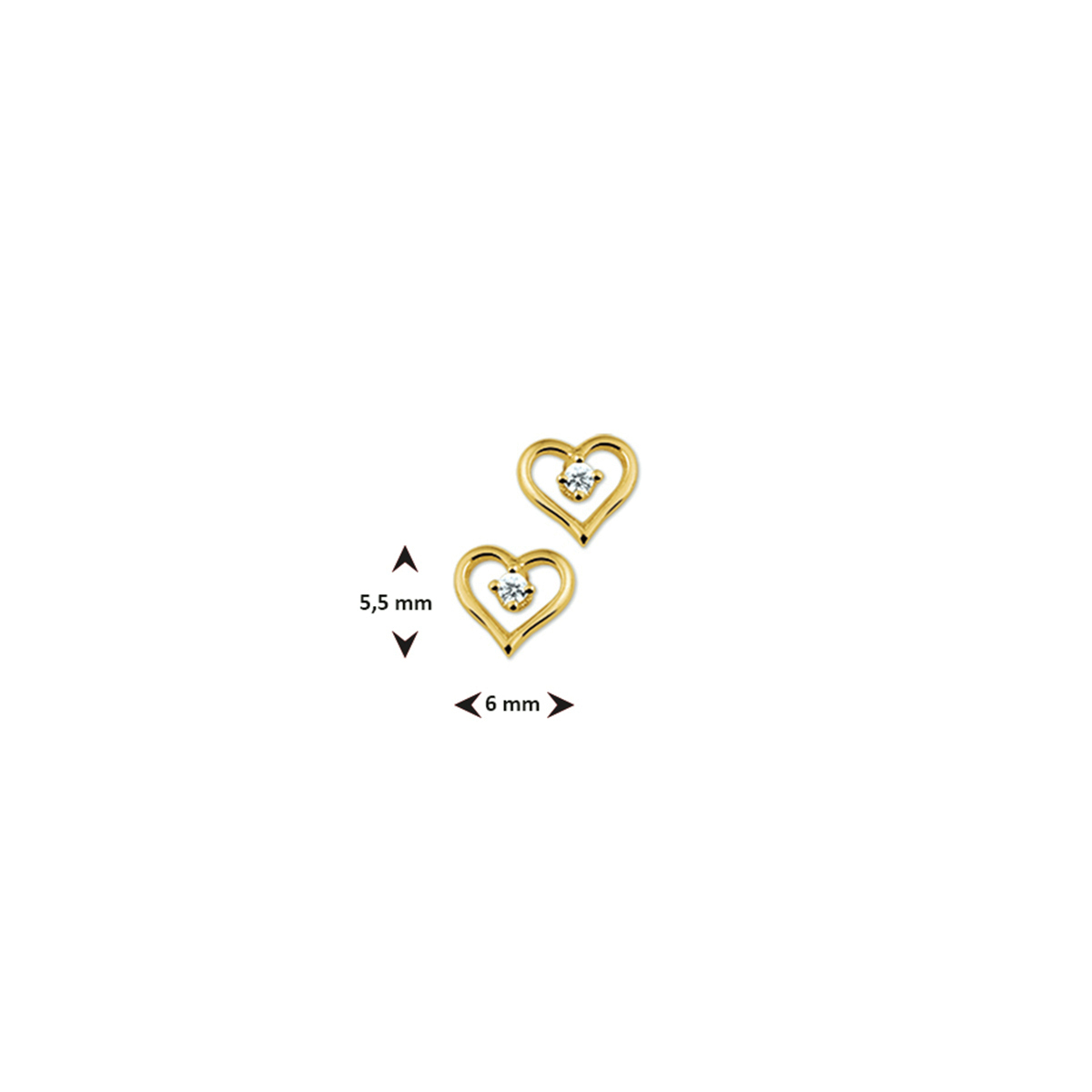 Geelgouden oorknoppen in de vorm van een hartje en uitgevoerd met een schitterende zirkonia. De oorknoppen hebben een afmeting van 5.5x6mm.