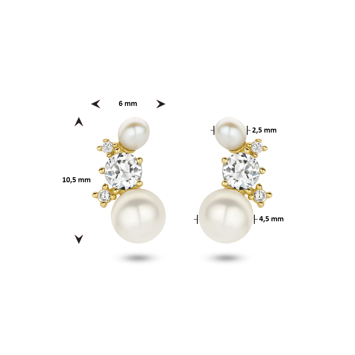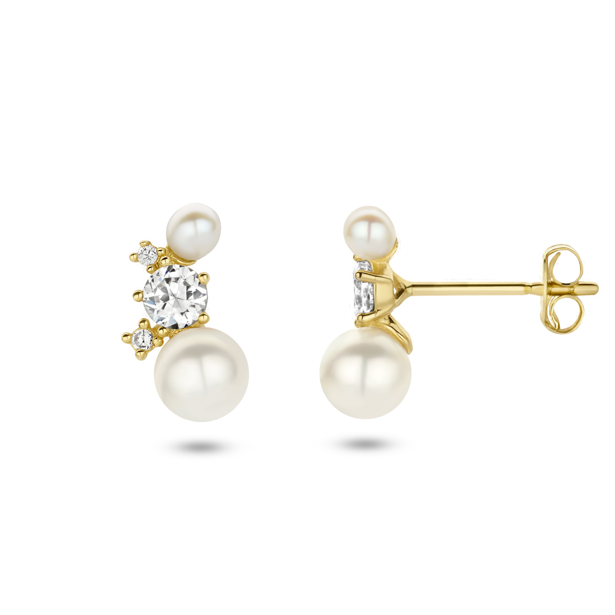 14k Geelgouden oorknoppen uitgevoerd met zirkonia en zoetwaterparels van 2.5mm en 4.5mm. De oorknoppen hebben een afmeting van 10.5x6mm.