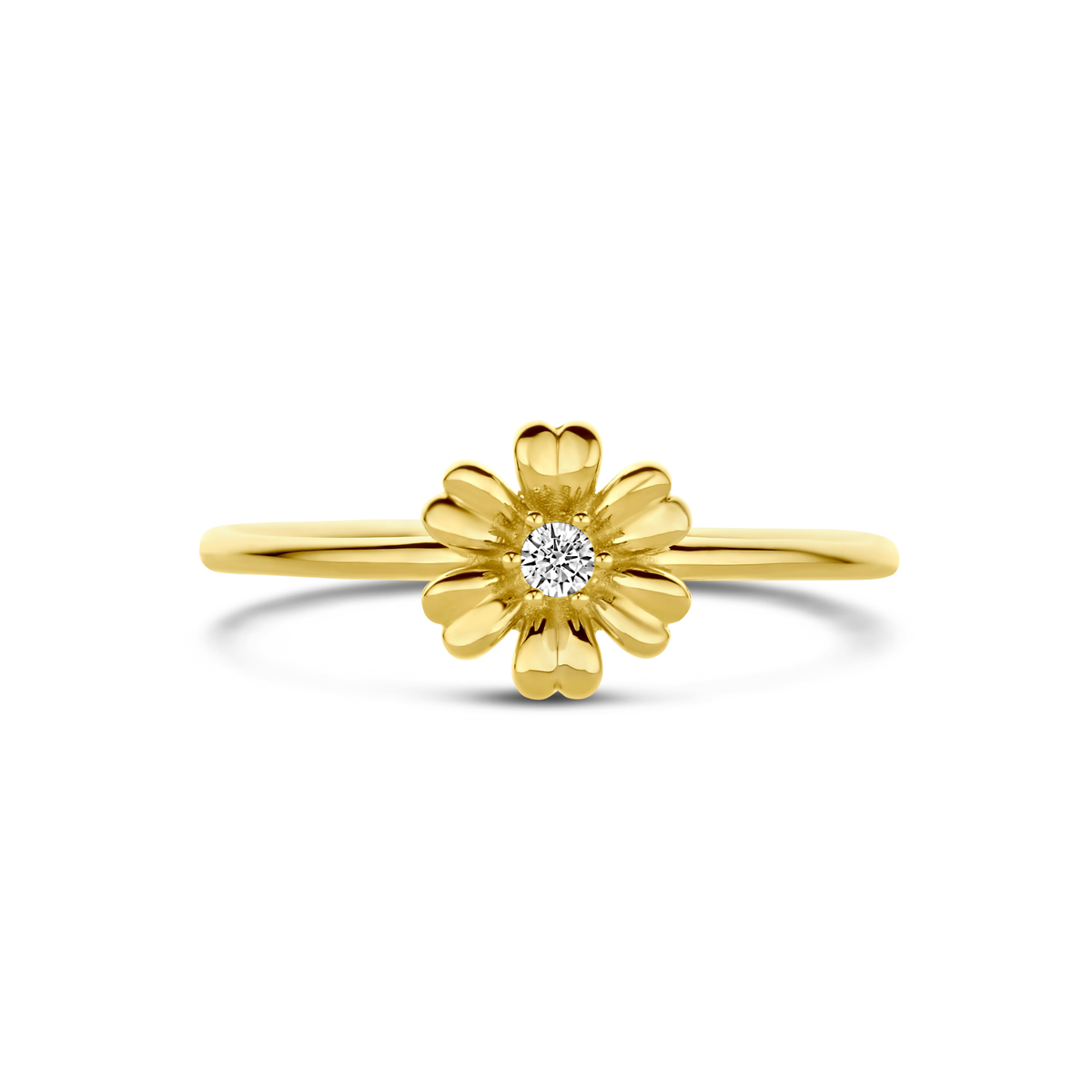 14k Geelgouden ring uitgevoerd in de vorm van een bloem met zirkonia. De ring heeft een breedte van 7.5mm.