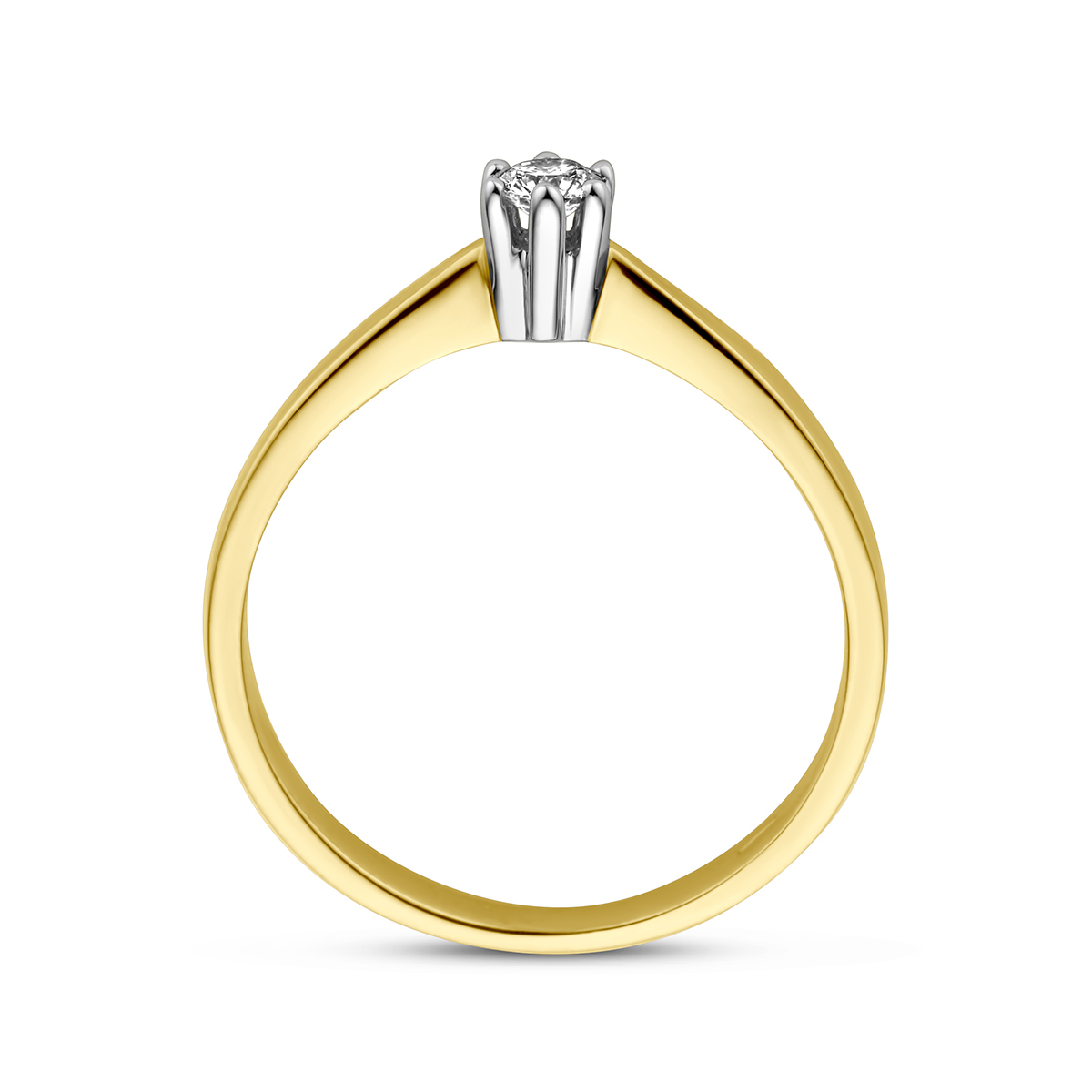Luxe bicolor geel- en witgouden ring met een breedte van 4mm uitgevoerd met een briljant geslepen diamant van 0.10ct. Tip: Perfect kado voor dierbare of geliefde! Diamonds are girls best friend!