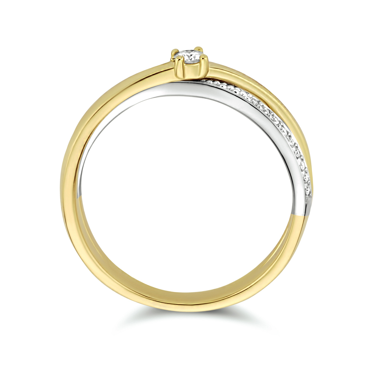 14k Bicolor geel- en witgouden ring uitgevoerd met schitterend diamant. De ring heeft een breedte van 5mm en de solitair diamant heeft een diamantgewicht van 0.06ct.