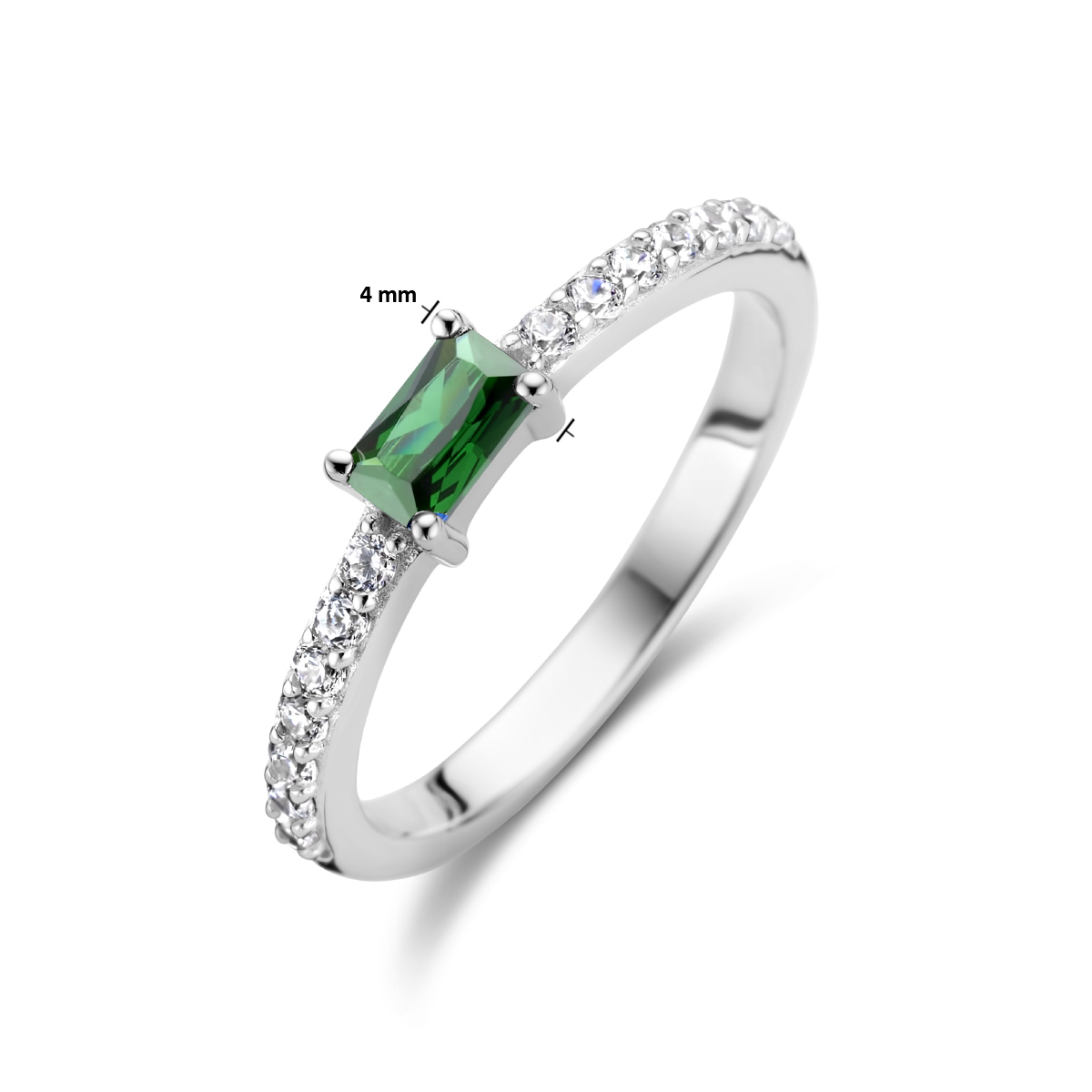 Gerhodineerd zilveren ring uitgevoerd met een schitterend groen en wit zirkonia. De ring heeft een breedte van 4mm.