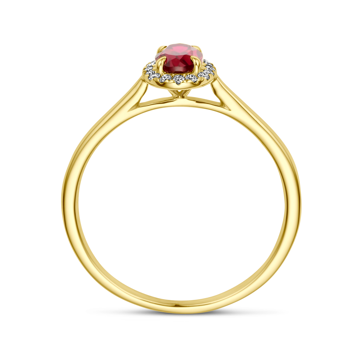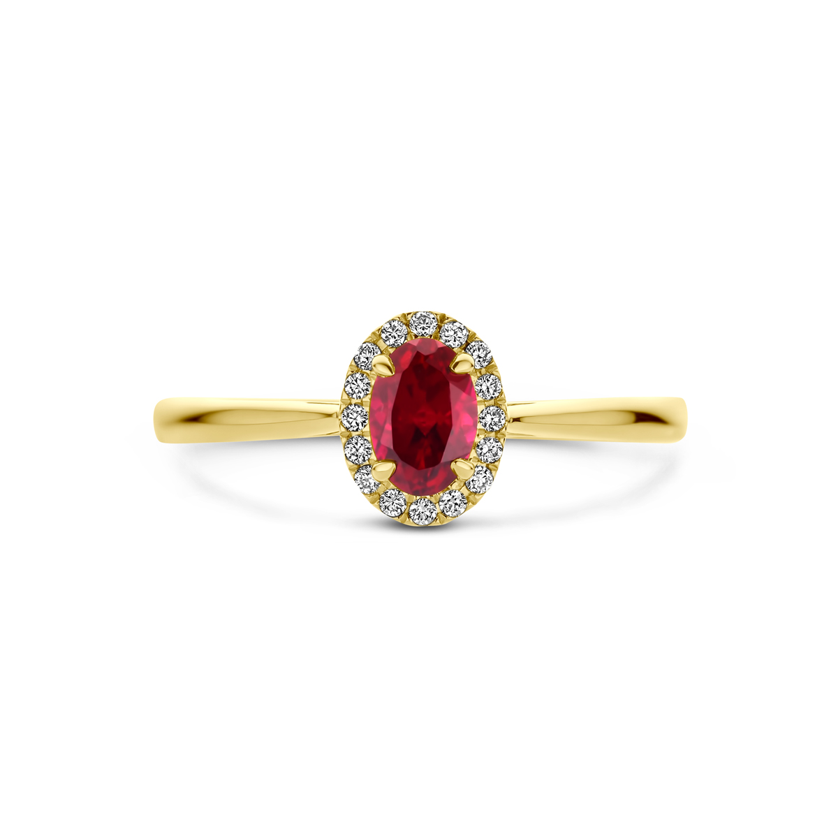14k Geelgouden ring uitgevoerd met lab grown robijn en lab grown diamanten. De ring heeft een afmeting van 8x6.5mm en het diamantgewicht is 0.075ct.Lab grown diamanten zijn diamanten die ontstaan in een laboratorium. Onder extreem hoge druk en temperatuur wordt het natuurlijk ontstaansproces nagebootst met als eindresultaat een diamant met dezelfde chemische eigenschappen maar met een andere oorsprong.