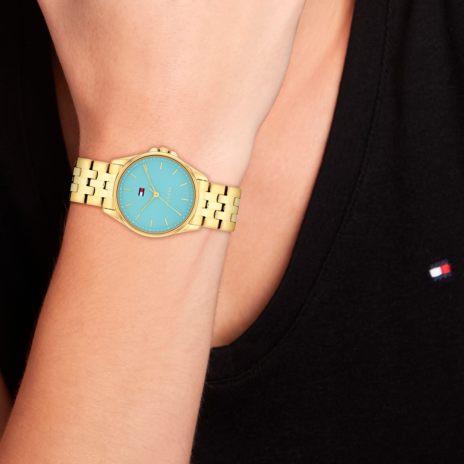 Dit specifieke horloge van Tommy Hilfiger uit de Jade serie met artikelnr: TH1782776 is een luxe dameshorloge die niet in je collectie mag ontbreken. Het stalen dameshorloge heeft een ronde goudkleurige kast met een gladde bezel en een blauwe emaille wijzerplaat met fijne wijzers en het Tommy logo. Aan de kast zit een goudkleurige glanzende schakelband met vouwsluiting. Het horloge heeft een mineraalglas, een afmeting van 30mm en is 3ATM.