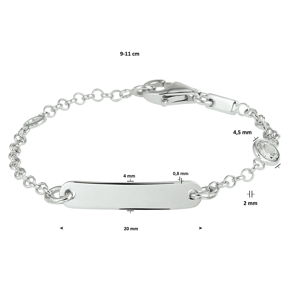 Gerhodineerd 925 zilveren kinder graveerarmband met een jasseron schakel, uitgevoerd met een plaat van 4x20mm, een karabijn sluiting en een heldere zirkonia. De schakelbreedte is 2.0mm. Info: Gerhodineerd zilver is door de rhodiumlaag beter bestand tegen verkleuren en krassen.